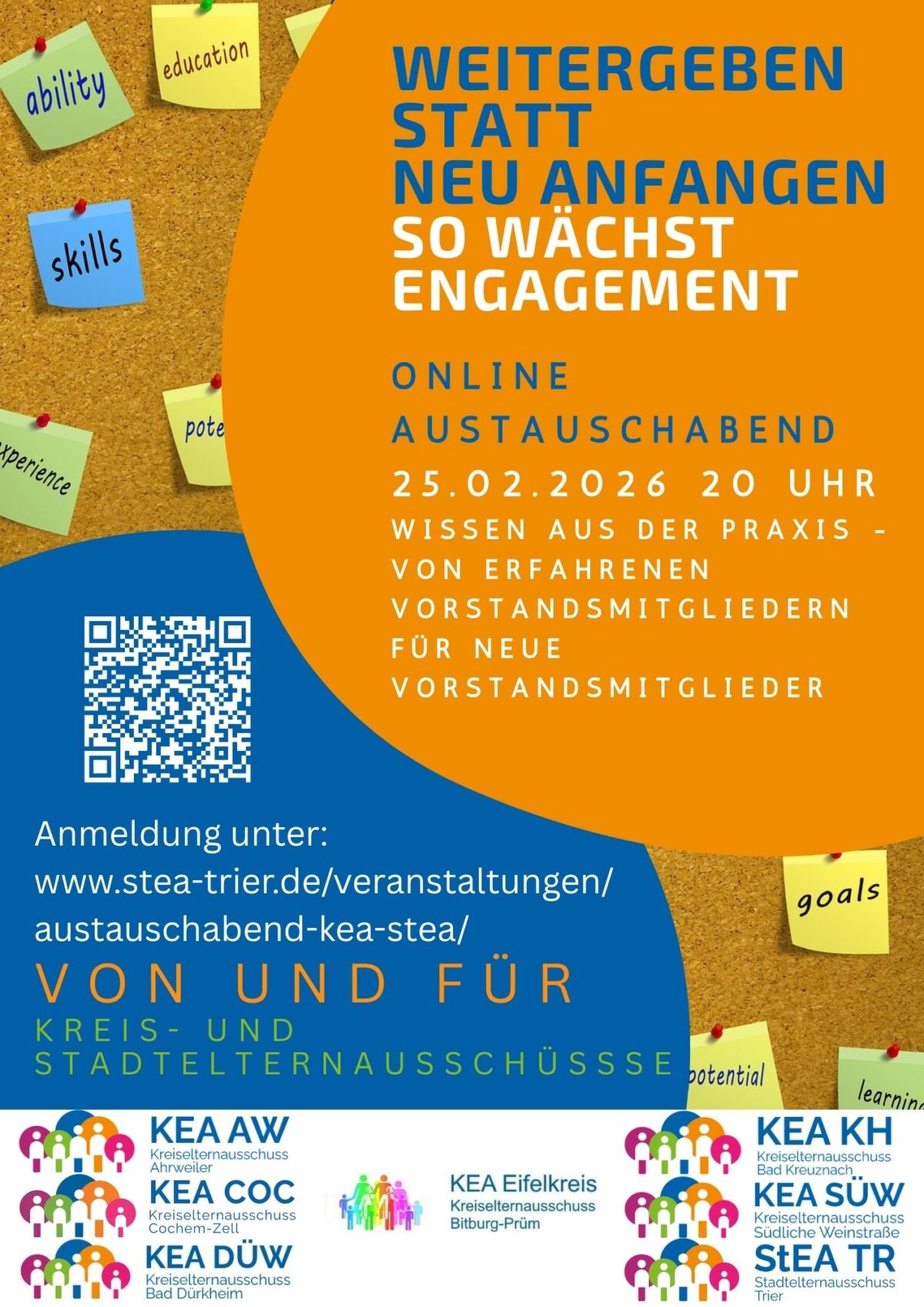 Unter diesem Motto laden sieben der Kreis- und Stadtelternausschüsse Rheinland-Pfalz zu einem gemeinsamen Online-Austauschabend ein. Ziel der Veranstaltung ist es, praxisnahes Wissen von erfahrenen Vorstandsmitgliedern an neu gewählte Vorstände der Kreis- und Stadtelternausschüsse (KEA / StEA) weiterzugeben.